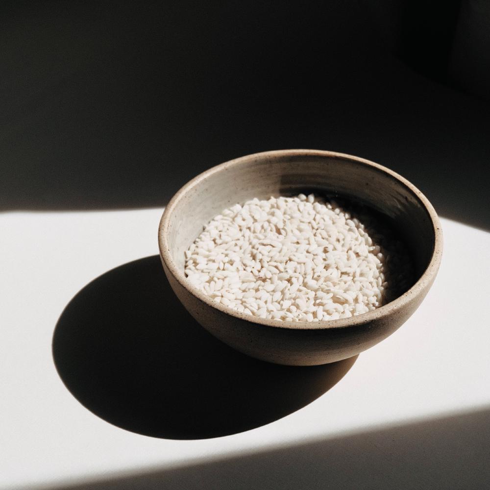Pictured: A small pottery bowl of uncooked short grain, white rice. The image was obtained from Unsplash at https://unsplash.com/photos/FXdpfV9TBRs