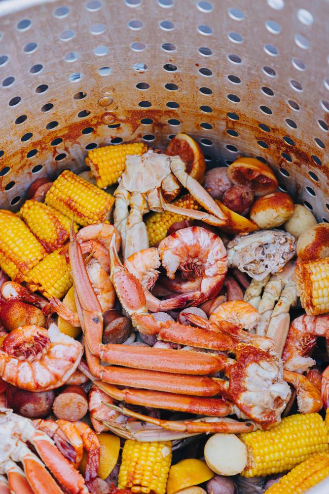 Pictured: A metal strainer full of the food you'd cook in a shrimp boil. The image was obtained from Unsplash at https://unsplash.com/photos/gI64ELP4FwA